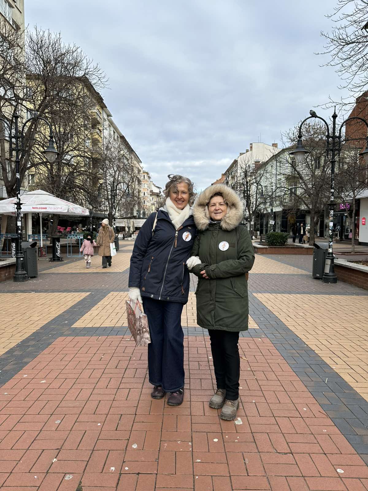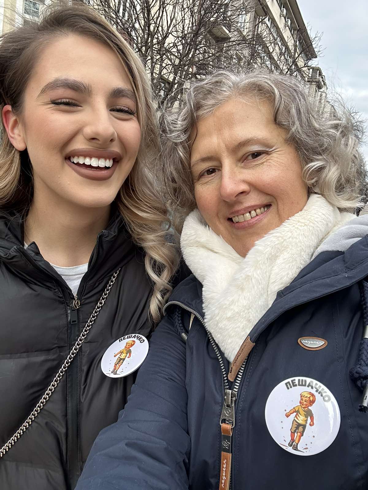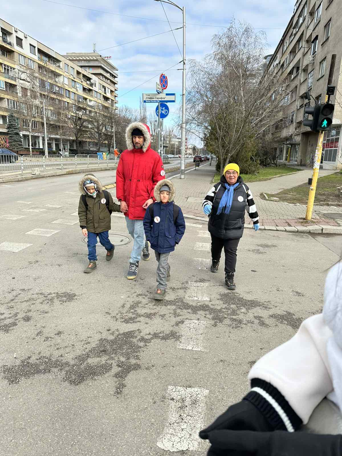 На всички обаче по детски искряха очите, а усмивките се раздаваха щедро и от сърце! Филип и Андре Николови гордо носеха значките си с прекрасното лого на Владимир Матов. Цвета Матова и Дими Матова бяха новите участници в идеята Пешачко и присъствието им ни донесе вълнуващ младежки заряд. Стефан Стефанов отново доказа твърдата си подкрепа и усмихна всички още повече. Владимир Николов направи шествието ни още по-забележимо с внушително присъствие и топла усмивка. Ние по-зрелите войни на Пешачко - аз, Антоанета Маринова, Лиана Петрова, Руми Пенева и Миглена Димитрова изразихме щастието си в оживени разговори и задоволство от постигнатото. Тони Маринова беше именничка днес. Здрава да ни е, защото е много ценна за Пешачко!