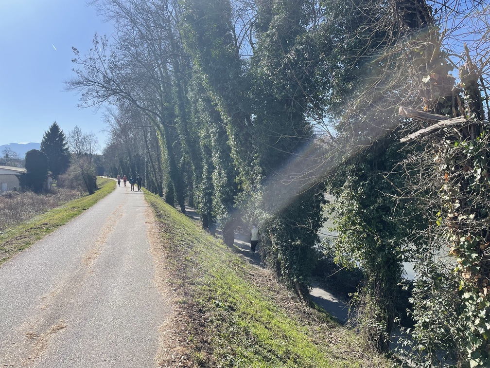След тренировката обичам да се разходя до самия кампус и да се заредя с духа на шматкащи се студенти и студентки пред библиотеката. След това се връщам по реката и тръгвам към втората площадка за спорт. По пътя минавам до една голяма градина (ферма за зеленчуци) в която преди време си имахме дори и кокошки, но явно лисиците тук не спят, и вече кокошки няма! Около Гренобъл е пълно с истински производители на храна (това е част от културата), в някоя от следващите статии ще ви покажа какви фермерски пазарчета имаме! Сега ми прави впечатление как на всяка от снимките има планина — тук човек трябва доста да се постарае за да не хване планини в обектива си.